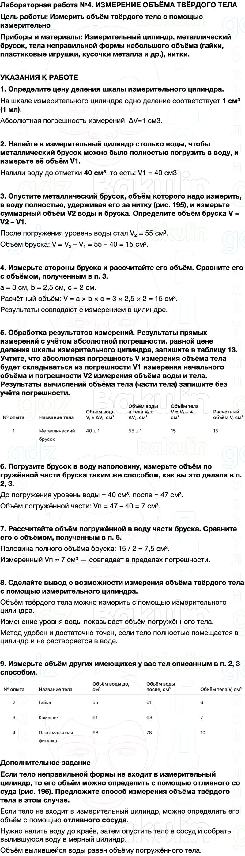 7. Рассчитайте объём погружённой в воду части бруска. Сравните его с объёмом, полученным в п. 6.