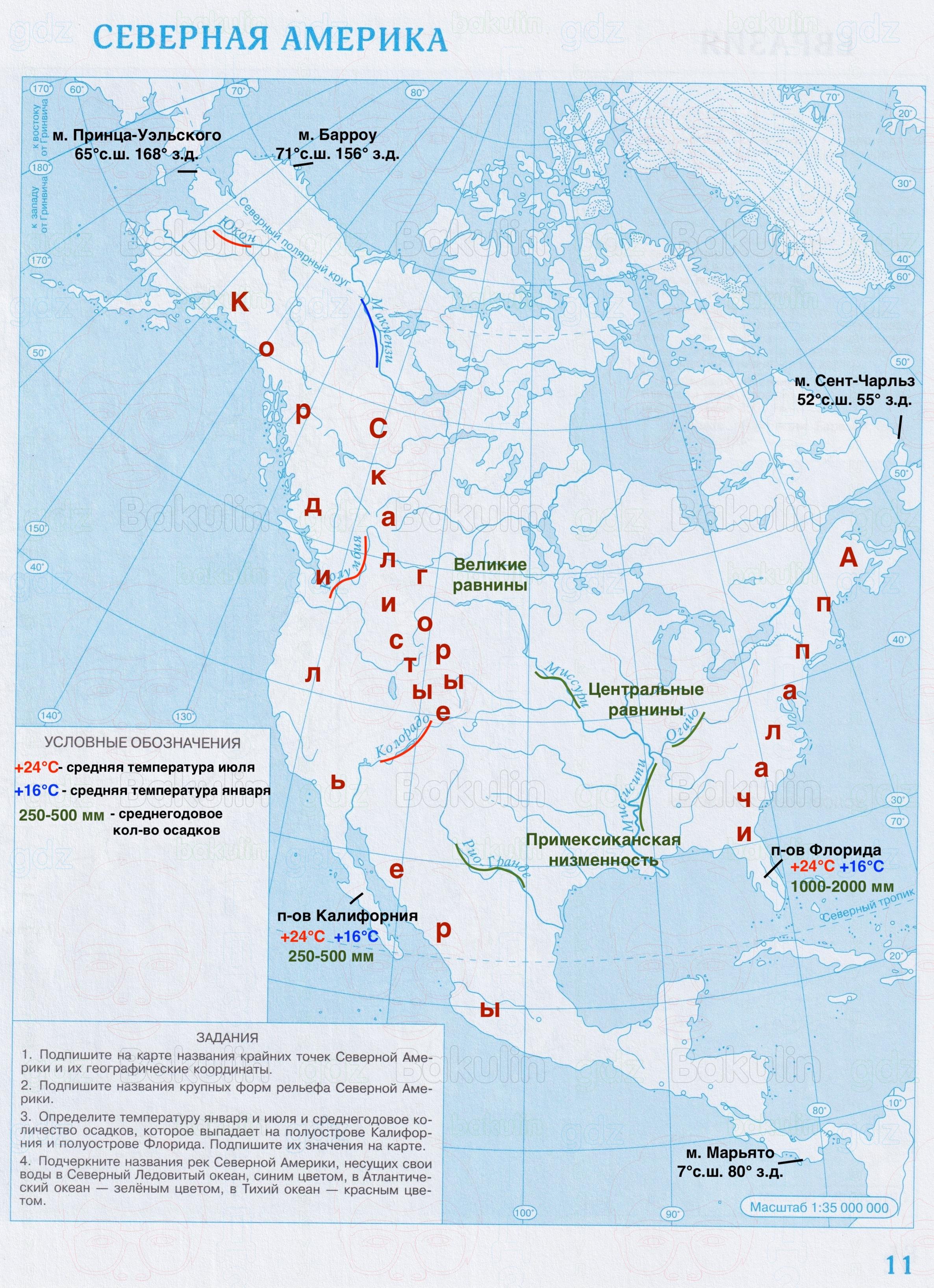 1. Подпишите на карте названия крайних точек Северной Америки и их географические координаты.