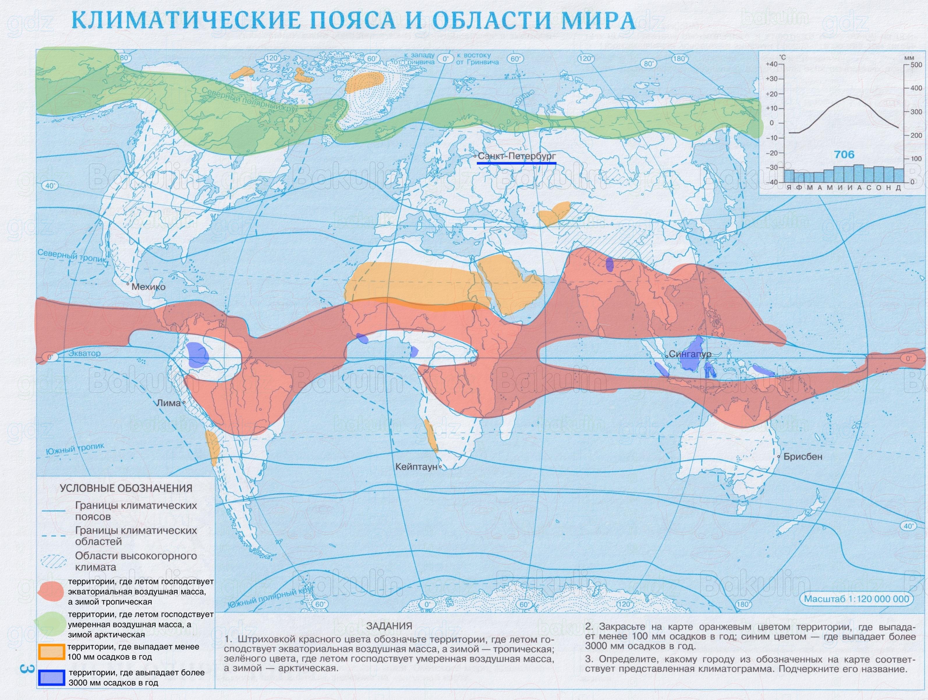2. Закрасьте на карте оранжевым цветом территории, где выпадает менее 100 мм осадков в год: синим цветом — где выпадает более 3000 мм осадков в год.