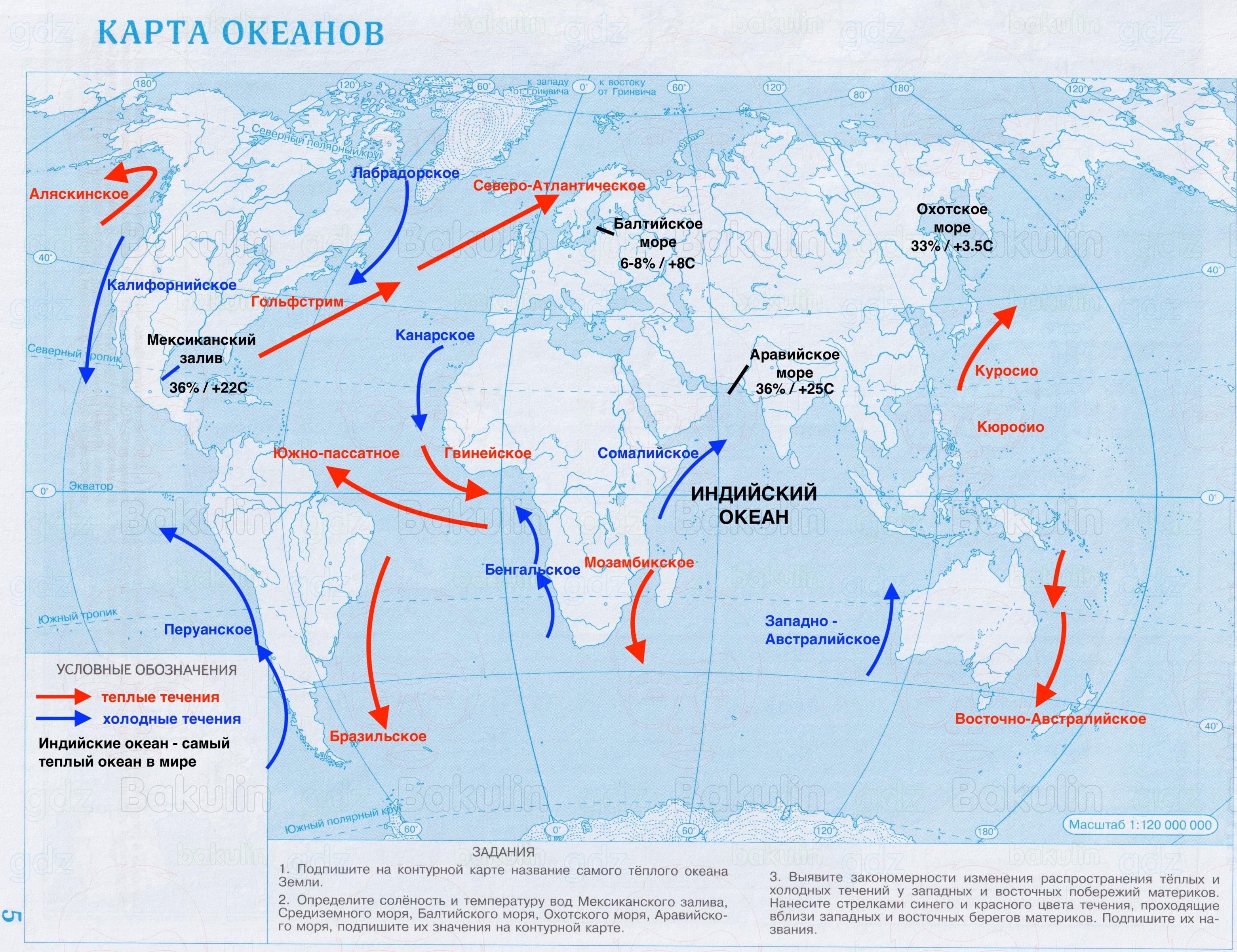 1. Подпишите на контурной карте название самого тёплого океана Земли