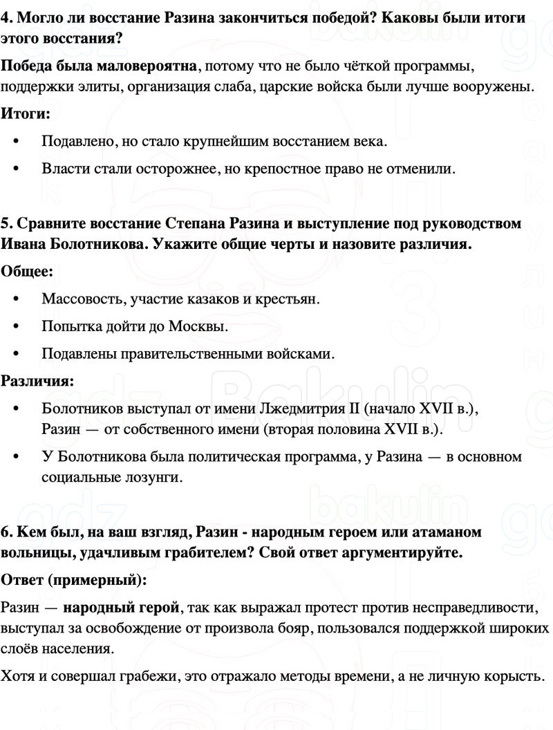 5. Сравните восстание Степана Разина и выступление под руководством Ивана Болотникова. Укажите общие черты и назовите различия.
