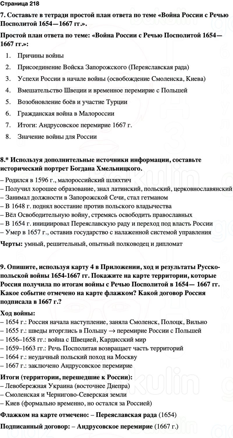 7. Составьте в тетради простой план ответа по теме «Война России с Речью Посполитой 1654—1667 гг.».