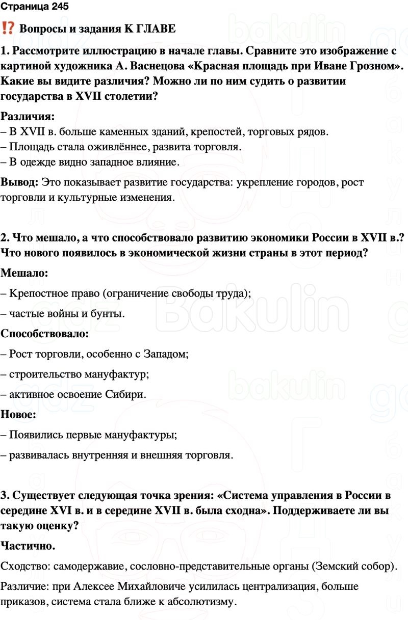 1. Рассмотрите иллюстрацию в начале главы. Сравните это изображение с картиной художника А. Васнецова «Красная площадь при Иване Грозном». Какие вы видите различия? Можно ли по ним судить о развитии государства в XVII столетии?