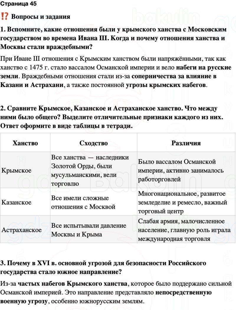 2. Сравните Крымское, Казанское и Астраханское ханство. Что между ними было общего? Выделите отличительные признаки каждого из них. Ответ оформите в виде таблицы в тетради.