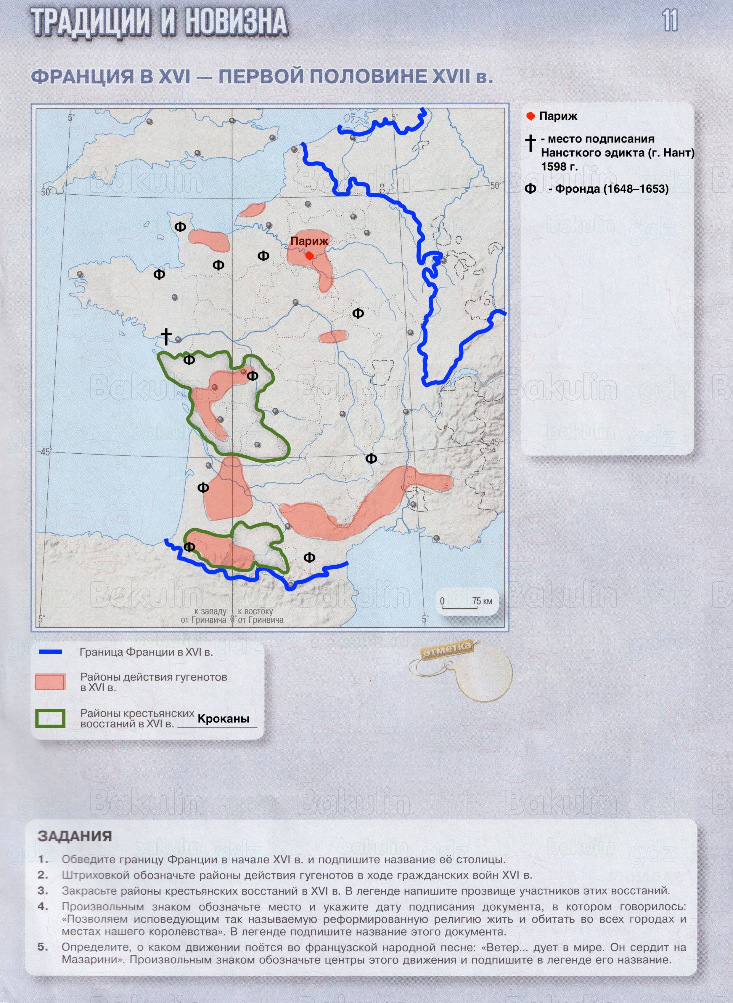 5. Определите, о каком движении поётся во французской народной песне: «Ветер... дует в мире. Он сердит на Мазарини». Произвольным знаком обозначьте центры этого движения и подпишите в легенде его название.