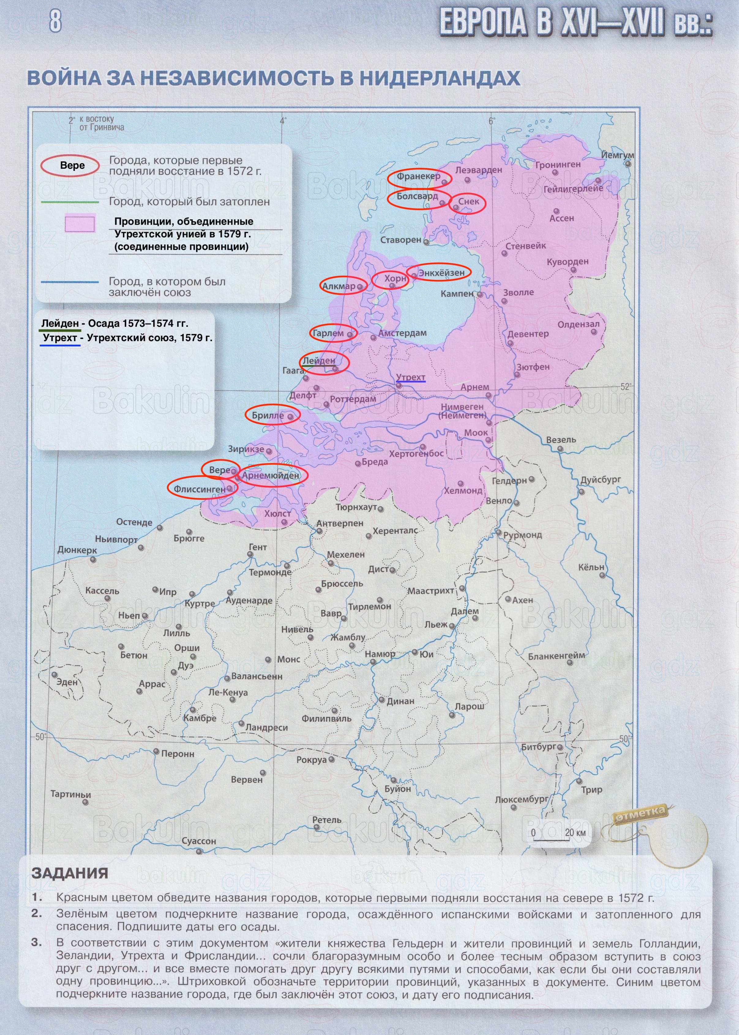3. В соответствии с этим документом «жители княжества Гельдерн и жители провинций и земель Голландии, Зеландии, Утрехта и Фрисландии... сочли благоразумным особо и более тесным образом вступить в союз дру с другом.. и все вместе помогать друг доугу всякими путями и способами, как если об они составляли друг с другом... и все вместе помогать друг другу всякими путями и способами, как если бы они составляли одну провинцию..». Штриховкой обозначьте территории провинций, указанных в документе. Синим цветом подчеркните название города, где был заключён этот союз, и дату его подписания.