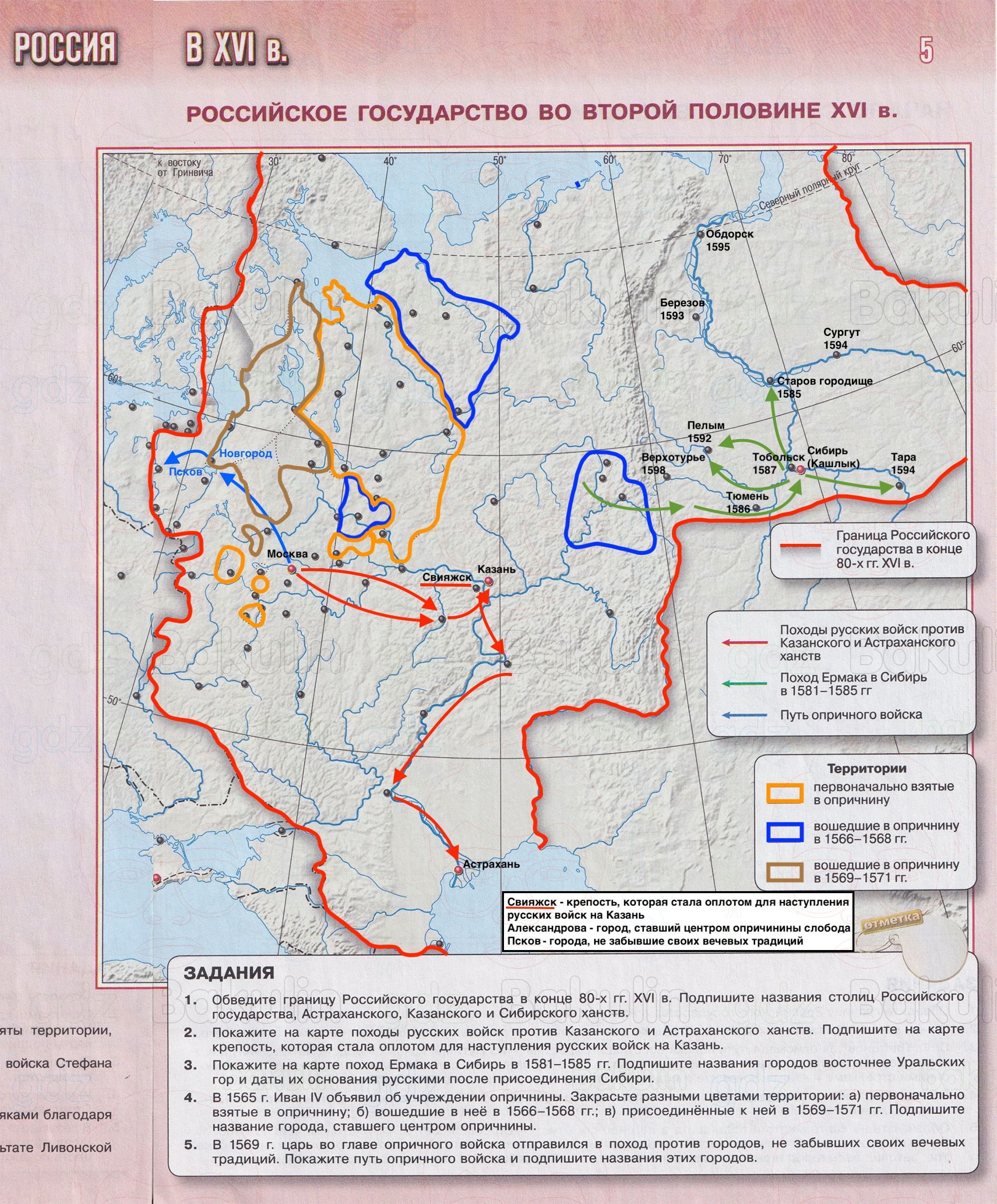 5. В 1569 г. царь во главе опричного войска отправился в поход против городов, не забывших своих вечевых традиций. Покажите путь опричного войска и подпишите названия этих городов.