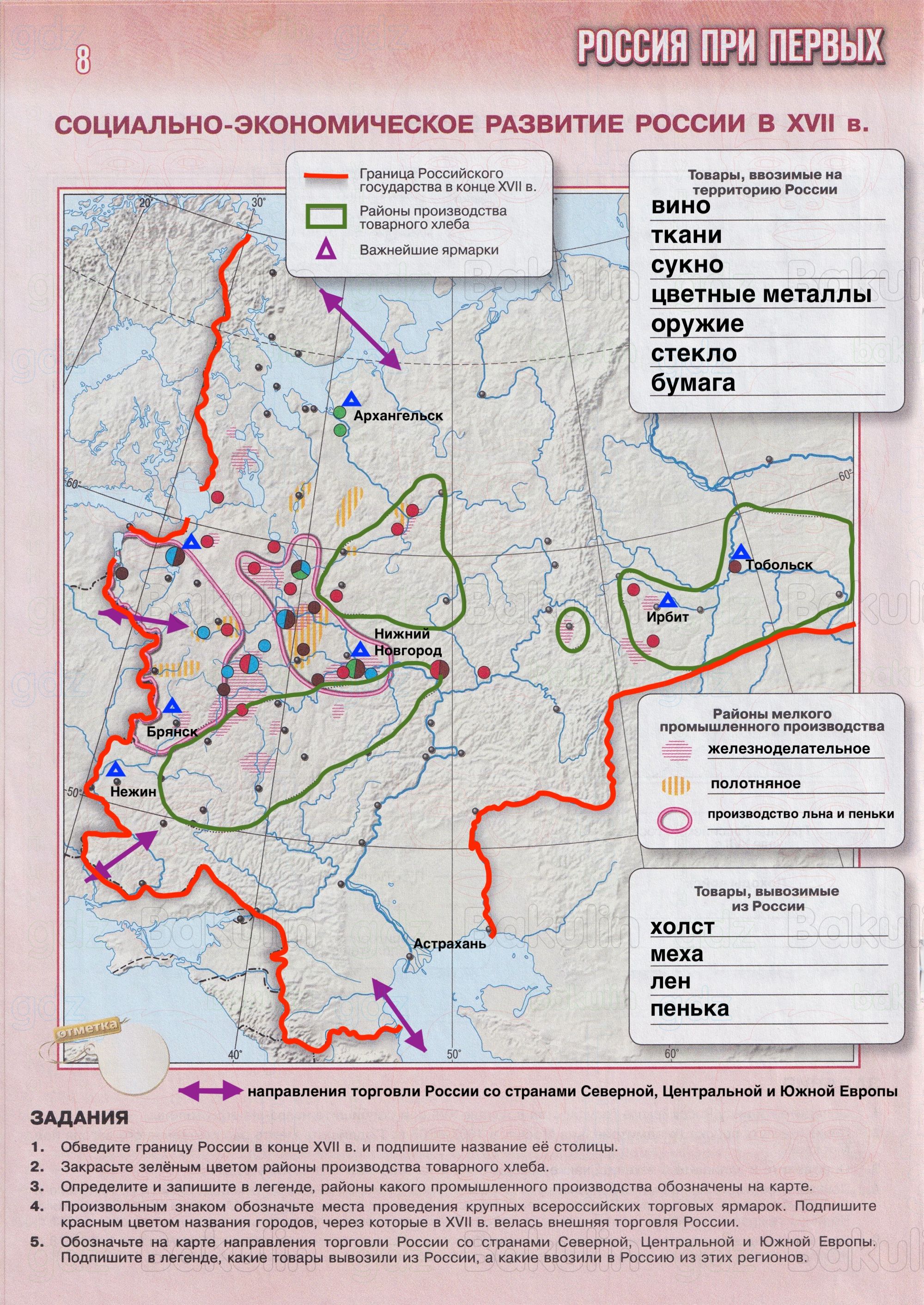 5. Обозначьте на карте направления торговли России со странами Северной, Центральной и Южной Европы. Подпишите в легенде, какие товары вывозили из России, а какие ввозили в Россию из этих регионов.