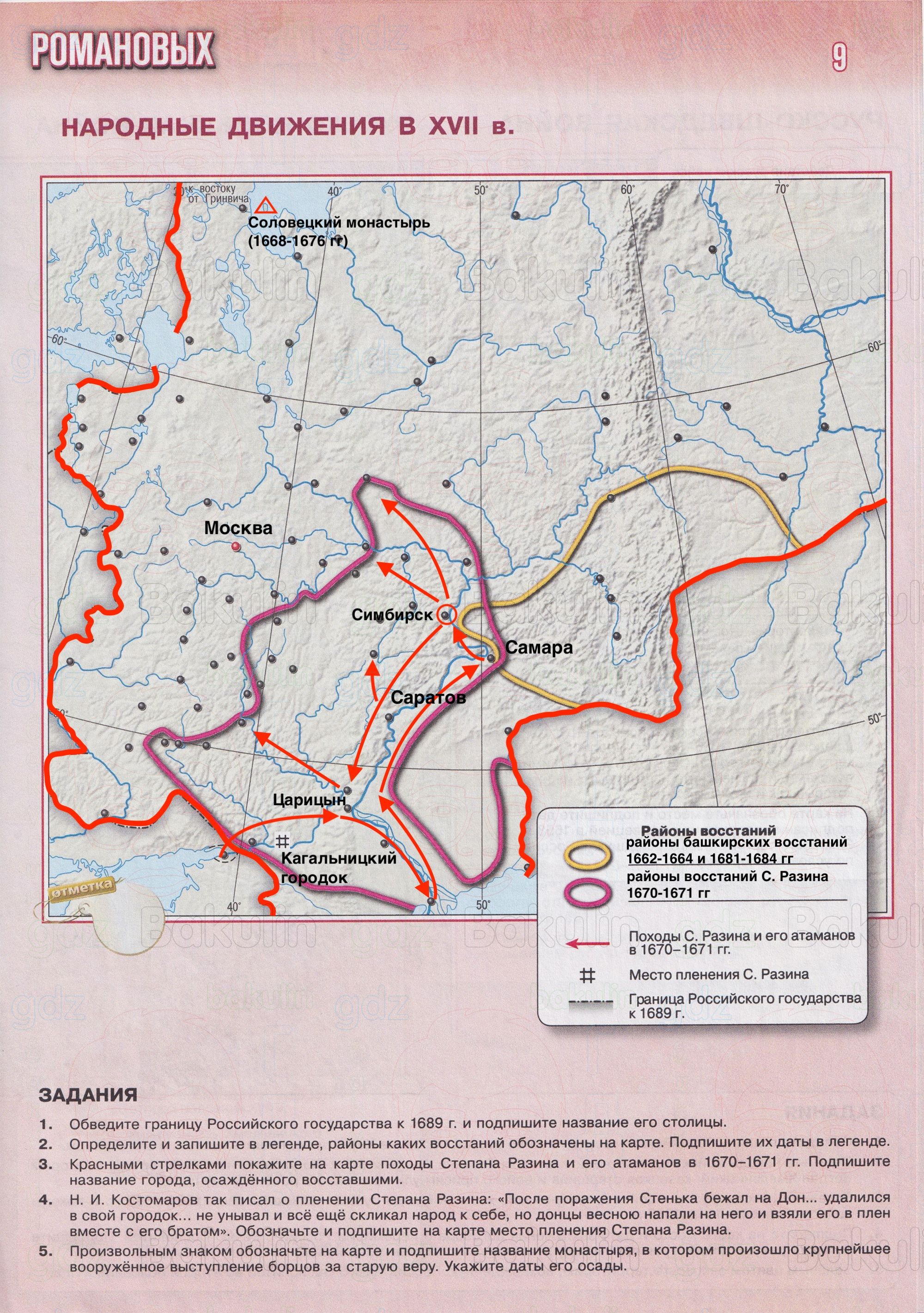 3. Красными стрелками покажите на карте походы Степана Разина и его атаманов в 1670-1671 гг. Подпишите название города, осаждённого восставшими.