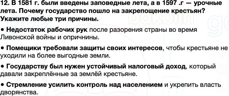 12. В 1581 г. были введены заповедные лета, а в 1597 .г — урочные лета. Почему государство пошло на закрепощение крестьян? Укажите любые три причины.
