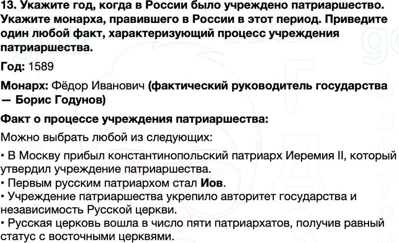 13. Укажите год, когда в России было учреждено патриаршество. Укажите монарха, правившего в России в этот период. Приведите один любой факт, характеризующий процесс учреждения патриаршества.
