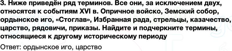 3. Ниже приведён ряд терминов. Все они, за исключением двух, относятся к событиям XVI в. Опричное войско, Земский собор, ордынское иго, «Стоглав», Избранная рада, стрельцы, казачество, царство, рядовичи, приказы. Найдите и подчеркните термины, относящиеся к другому историческому периоду