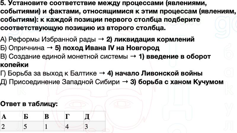 5. Установите соответствие между процессами (явлениями, событиями) и фактами, относящимися к этим процессам (явлениям, событиям): к каждой позиции первого столбца подберите соответствующую позицию из второго столбца.