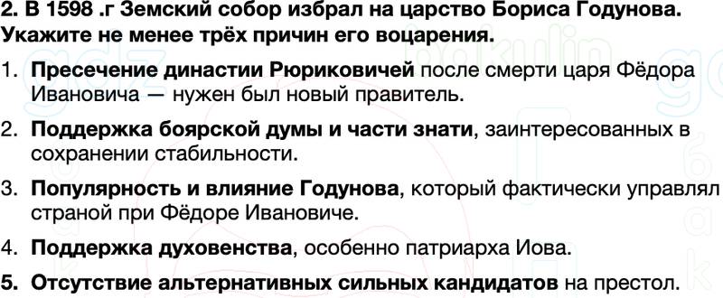 2. В 1598 .г Земский собор избрал на царство Бориса Годунова. Укажите не менее трёх причин его воцарения.