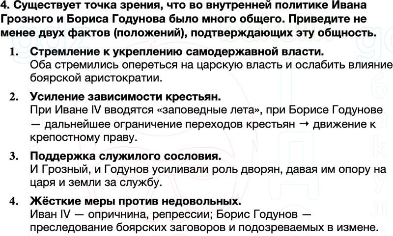 4. Существует точка зрения, что во внутренней политике Ивана Грозного и Бориса Годунова было много общего. Приведите не менее двух фактов (положений), подтверждающих эту общность.