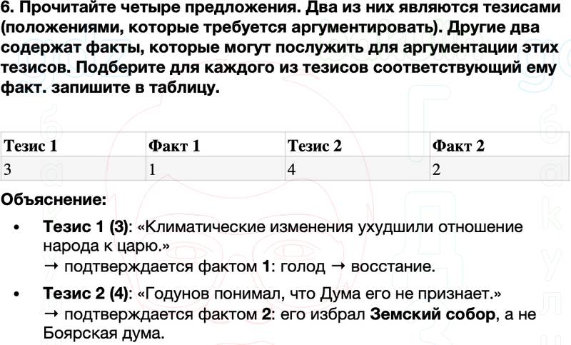 6. Прочитайте четыре предложения. Два из них являются тезисами (положениями, которые требуется аргументировать). Другие два содержат факты, которые могут послужить для аргументации этих тезисов. Подберите для каждого из тезисов соответствующий ему факт. запишите в таблицу.