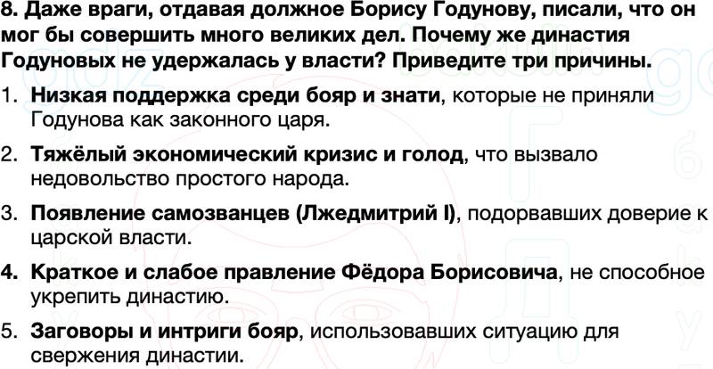 8. Даже враги, отдавая должное Борису Годунову, писали, что он мог бы совершить много великих дел. Почему же династия Годуновых не удержалась у власти? Приведите три причины.