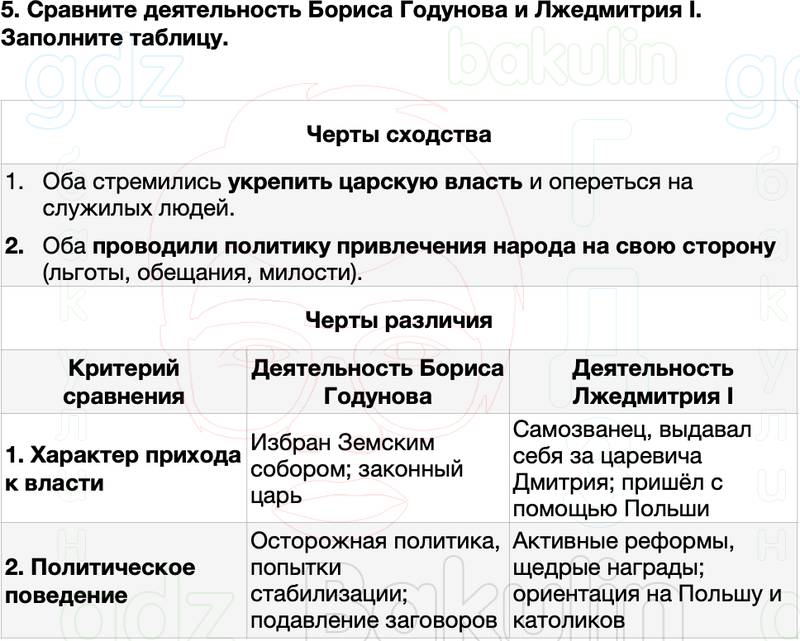 5. Сравните деятельность Бориса Годунова и Лжедмитрия I. Заполните таблицу.