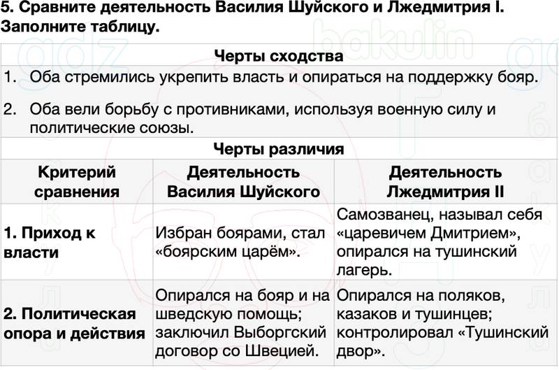 5. Сравните деятельность Василия Шуйского и Лжедмитрия I. Заполните таблицу.