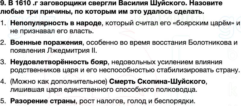 9. В 1610 .г заговорщики свергли Василия Шуйского. Назовите любые три причины, по которым им это удалось сделать.