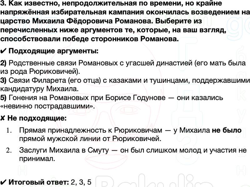 3. Как известно, непродолжительная по времени, но крайне напряжённая избирательная кампания окончилась возведением на царство Михаила Фёдоровича Романова. Выберите из перечисленных ниже аргументов те, которые, на ваш взгляд, способствовали победе сторонников Романова.