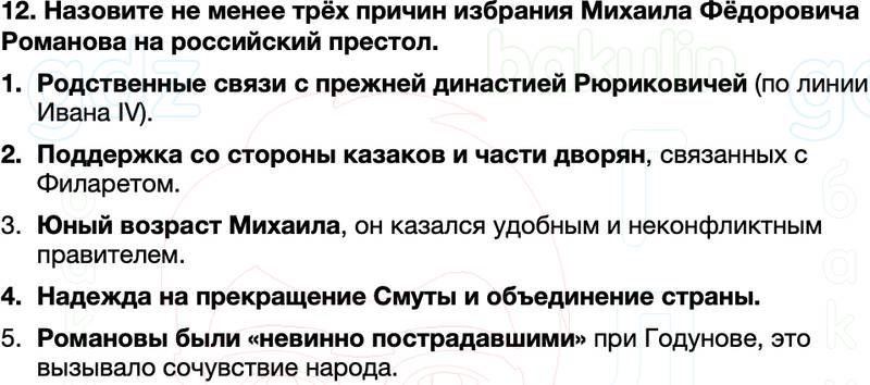 12. Назовите не менее трёх причин избрания Михаила Фёдоровича Романова на российский престол.