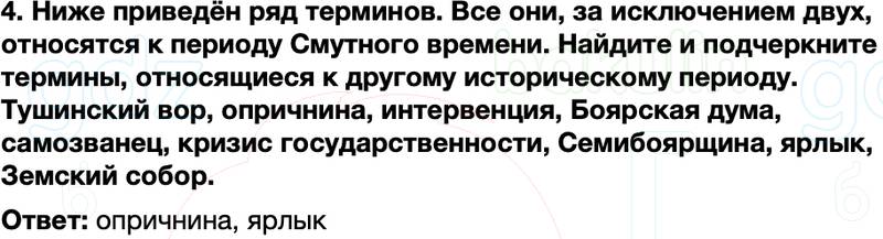 4. Ниже приведён ряд терминов. Все они, за исключением двух, относятся к периоду Смутного времени. Найдите и подчеркните термины, относящиеся к другому историческому периоду. Тушинский вор, опричнина, интервенция, Боярская дума, самозванец, кризис государственности, Семибоярщина, ярлык, Земский собор.