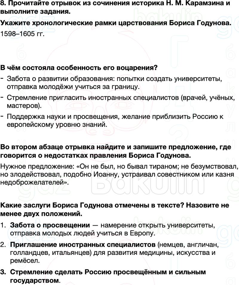 Во втором абзаце отрывка найдите и запишите предложение, где говорится о недостатках правления Бориса Годунова. Какие заслуги Бориса Годунова отмечены в тексте? Назовите не менее двух положений.