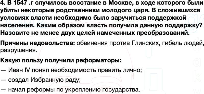 4. В 1547 .г случилось восстание в Москве, в ходе которого были убиты некоторые родственники молодого царя. В сложившихся условиях власти необходимо было заручиться поддержкой населения. Каким образом власть получила данную поддержку? Назовите не менее двух целей намеченных преобразований.