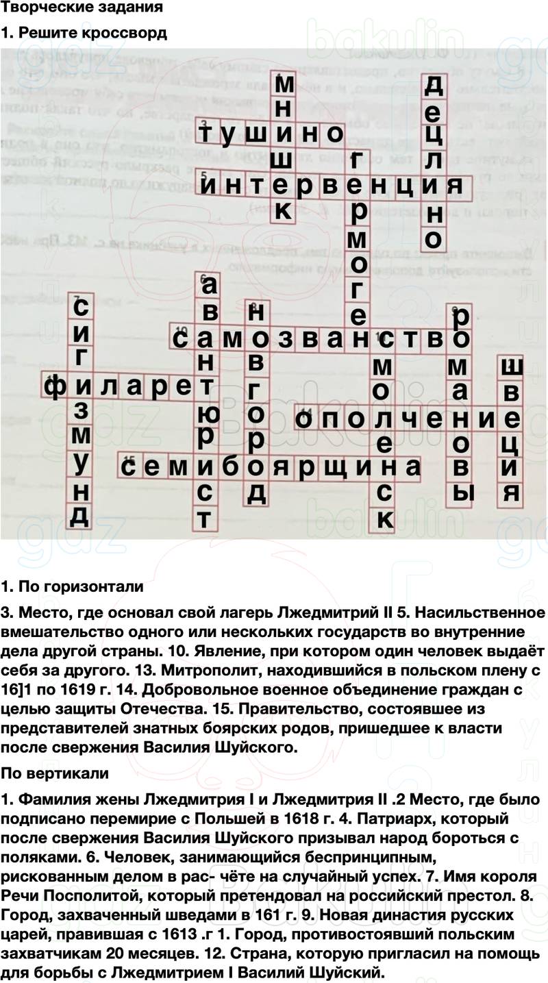 3. Место, где основал свой лагерь Лжедмитрий IІ 5. Насильственное вмешательство одного или нескольких государств во внутренние дела другой страны. 10. Явление, при котором один человек выдаёт себя за другого. 13. Митрополит, находившийся в польском плену с 16]1 по 1619 г. 14. Добровольное военное объединение граждан с целью защиты Отечества. 15. Правительство, состоявшее из представителей знатных боярских родов, пришедшее к власти после свержения Василия Шуйского.