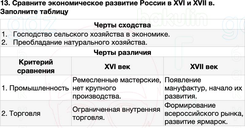 13. Сравните экономическое развитие России в XVI и XVII в. Заполните таблицу
