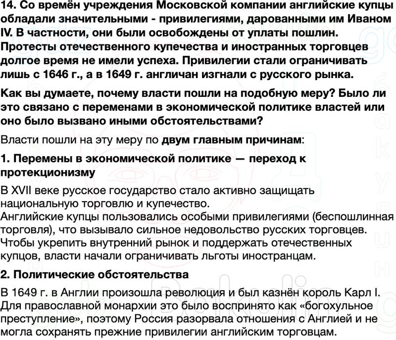 14. Со времён учреждения Московской компании английские купцы обладали значительными - привилегиями, дарованными им Иваном IV. В частности, они были освобождены от уплаты пошлин. Протесты отечественного купечества и иностранных торговцев долгое время не имели успеха. Привилегии стали ограничивать лишь с 1646 г., а в 1649 .г англичан изгнали с русского рынка. Как вы думаете, почему власти пошли на подобную меру? Было ли это связано с переменами в экономической политике властей или оно было вызвано иными обстоятельствами?