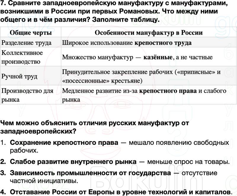 7. Сравните западноевропейскую мануфактуру с мануфактурами, возникшими в России при первых Романовых. Что между ними общего и в чём различия? Заполните таблицу.