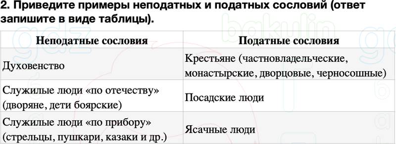 2. Приведите примеры неподатных и податных сословий (ответ запишите в виде таблицы).