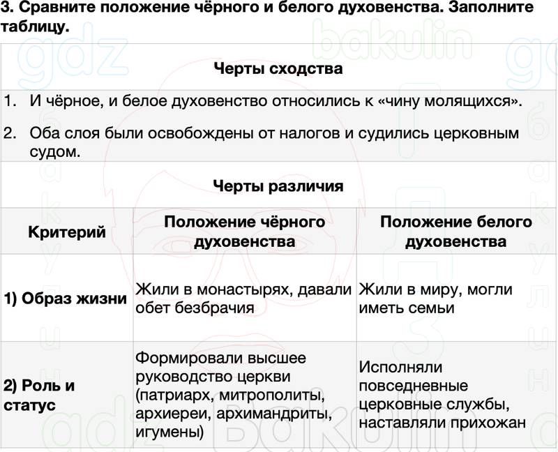 3. Сравните положение чёрного и белого духовенства. Заполните таблицу.