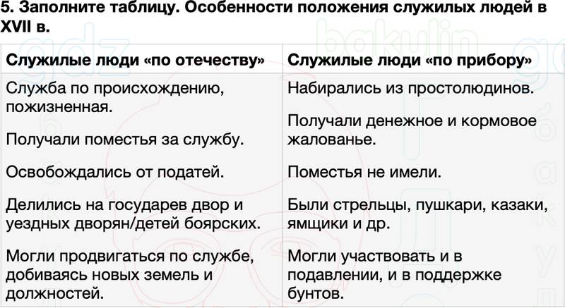 5. Заполните таблицу. Особенности положения служилых людей в XVII в.