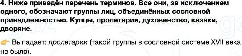 4. Ниже приведён перечень терминов. Все они, за исключением одного, обозначают группы лиц, объединённых сословной принадлежностью. Купцы, пролетарии, духовенство, казаки, дворяне.