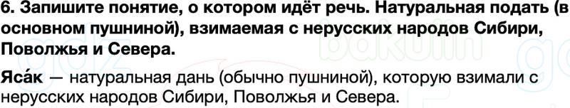 6. Запишите понятие, о котором идёт речь. Натуральная подать (в основном пушниной), взимаемая с нерусских народов Сибири, Поволжья и Севера.