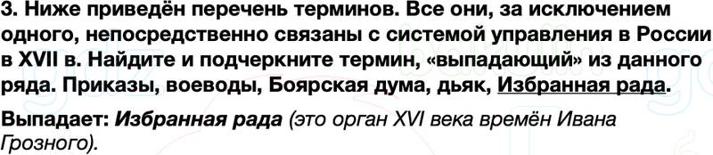 3. Ниже приведён перечень терминов. Все они, за исключением одного, непосредственно связаны с системой управления в России в XVII в. Найдите и подчеркните термин, «выпадающий» из данного ряда. Приказы, воеводы, Боярская дума, дьяк, Избранная рада.