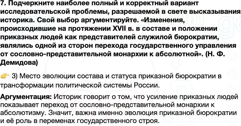 7. Подчеркните наиболее полный и корректный вариант исследовательской проблемы, раз- решаемой в свете высказывания историка. Свой выбор аргументируйте. «Изменения, происходившие на протяжении XVII в. в составе и положении приказных людей как представителей служилой бюрократии, являлись одной из сторон перехода государственного управления от сословно-представительной монархии к абсолютной». (Н. Ф. Демидова)