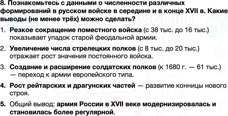 8. Познакомьтесь с данными о численности различных формирований в русском войске в середине и в конце XVII в. Какие выводы (не менее трёх) можно сделать?