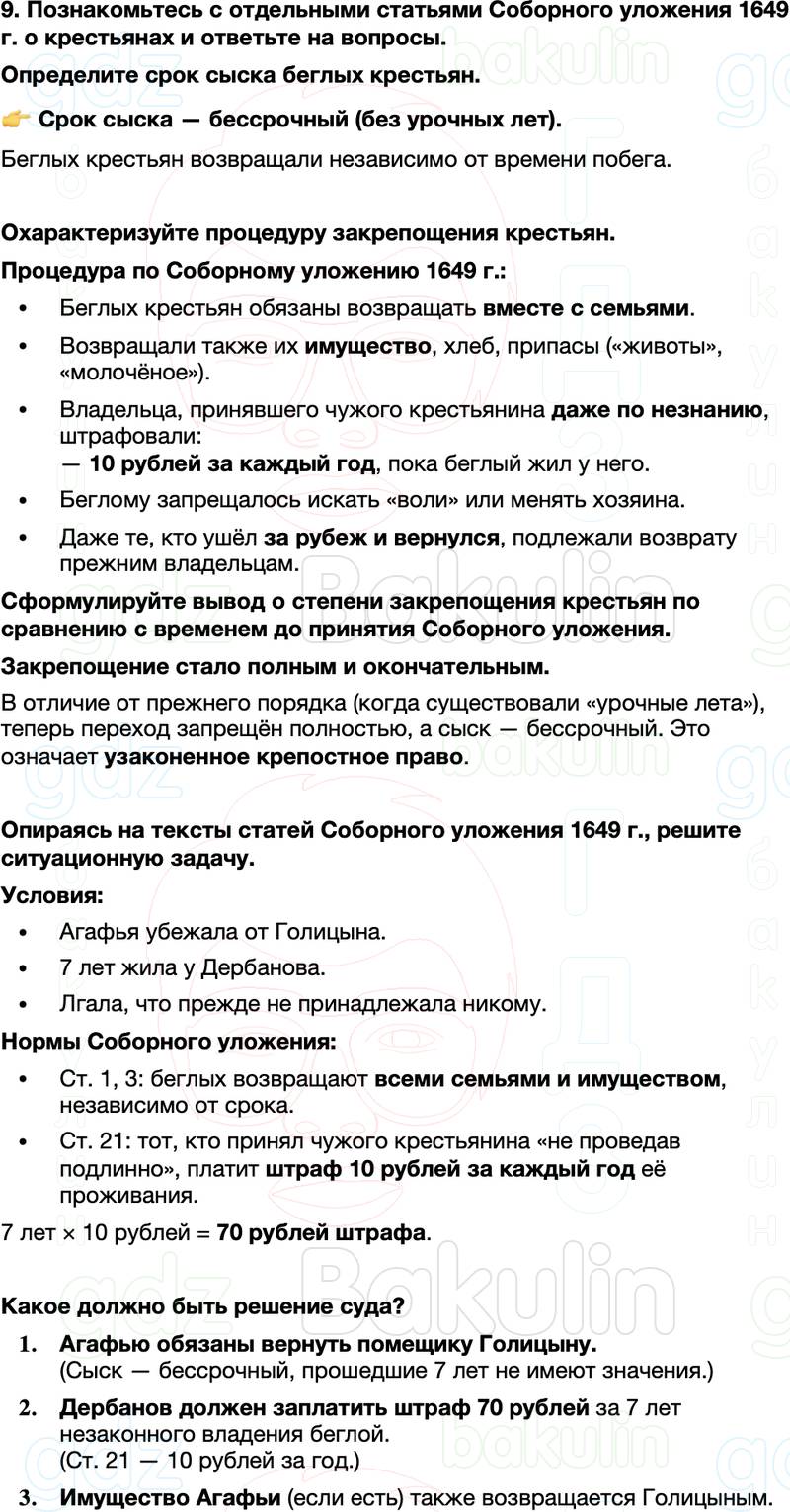 9. Познакомьтесь с отдельными статьями Соборного уложения 1649 г. о крестьянах и ответьте на вопросы.