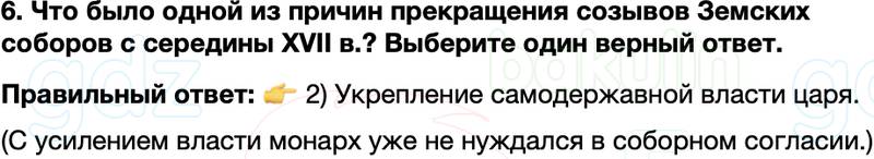 6. Что было одной из причин прекращения созывов Земских соборов с середины XVII в.? Выберите один верный ответ.