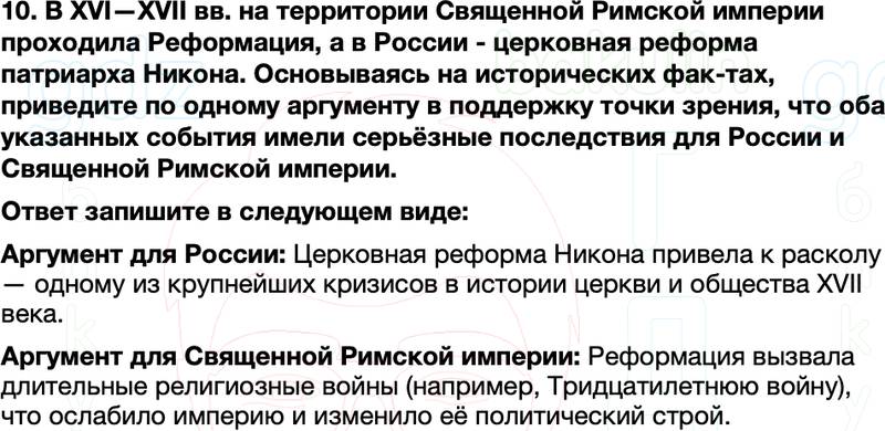 10. В XVI—XVII вв. на территории Священной Римской империи проходила Реформация, а в России - церковная реформа патриарха Никона. Основываясь на исторических фак-тах, приведите по одному аргументу в поддержку точки зрения, что оба указанных события имели серьёзные последствия для России и Священной Римской империи.