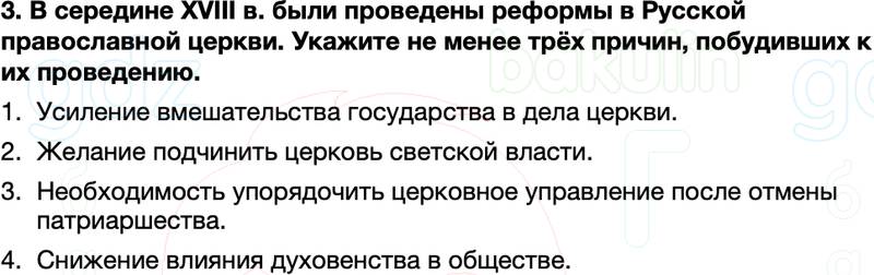 3. В середине XVIII в. были проведены реформы в Русской православной церкви. Укажите не менее трёх причин, побудивших к их проведению.