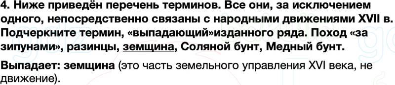 4. Ниже приведён перечень терминов. Все они, за исключением одного, непосредственно связаны с народными движениями XVII в. Подчеркните термин, «выпадающий»изданного ряда. Поход «за зипунами», разинцы, земщина, Соляной бунт, Медный бунт.