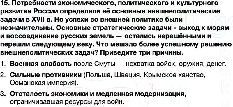 15. Потребности экономического, политического и культурного развития России определяли её основные внешнеполитические задачи в XVII в. Но успехи во внешней политике были незначительны. Основные стратегические задачи - выход к морям и воссоединение русских земель — остались нерешёнными и перешли следующему веку. Что мешало более успешному решению внешнеполитических задач? Приведите три причины.