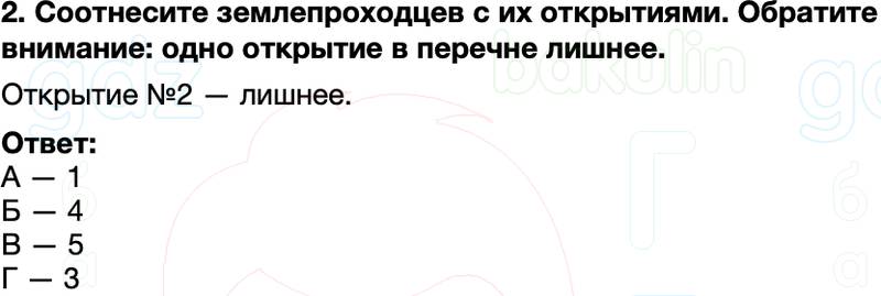 2. Соотнесите землепроходцев с их открытиями. Обратите внимание: одно открытие в перечне лишнее.