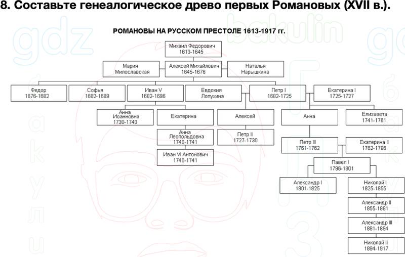 8. Составьте генеалогическое древо первых Романовых (XVII в.).