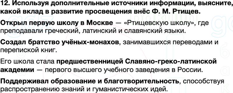 12. Используя дополнительные источники информации, выясните, какой вклад в развитие просвещения внёс Ф. М. Ртищев.